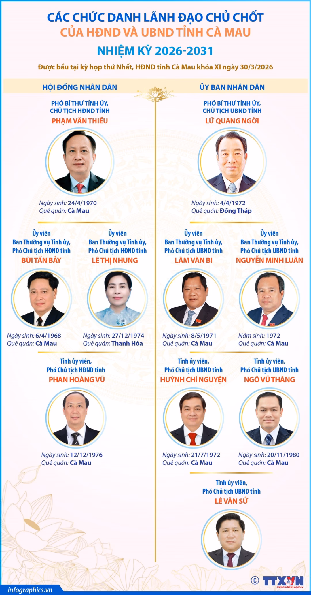 Thông tin chính thức về danh sách các chức danh lãnh đạo chủ chốt của HĐND và UBND tỉnh Cà Mau nhiệm kỳ 2026-2031 vừa được công bố tại Kỳ họp thứ nhất diễn ra vào ngày 30/3.