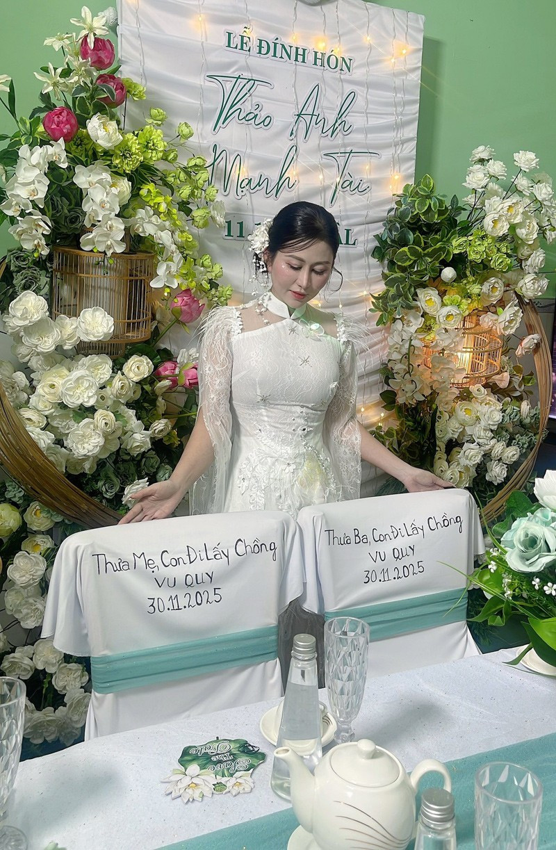Cô dâu Thảo Anh từ Đồng Tháp đã tạo nên một khoảnh khắc cảm động khi để lại hai chiếc ghế trống dành riêng cho cha mẹ đã mất trong lễ đính hôn.