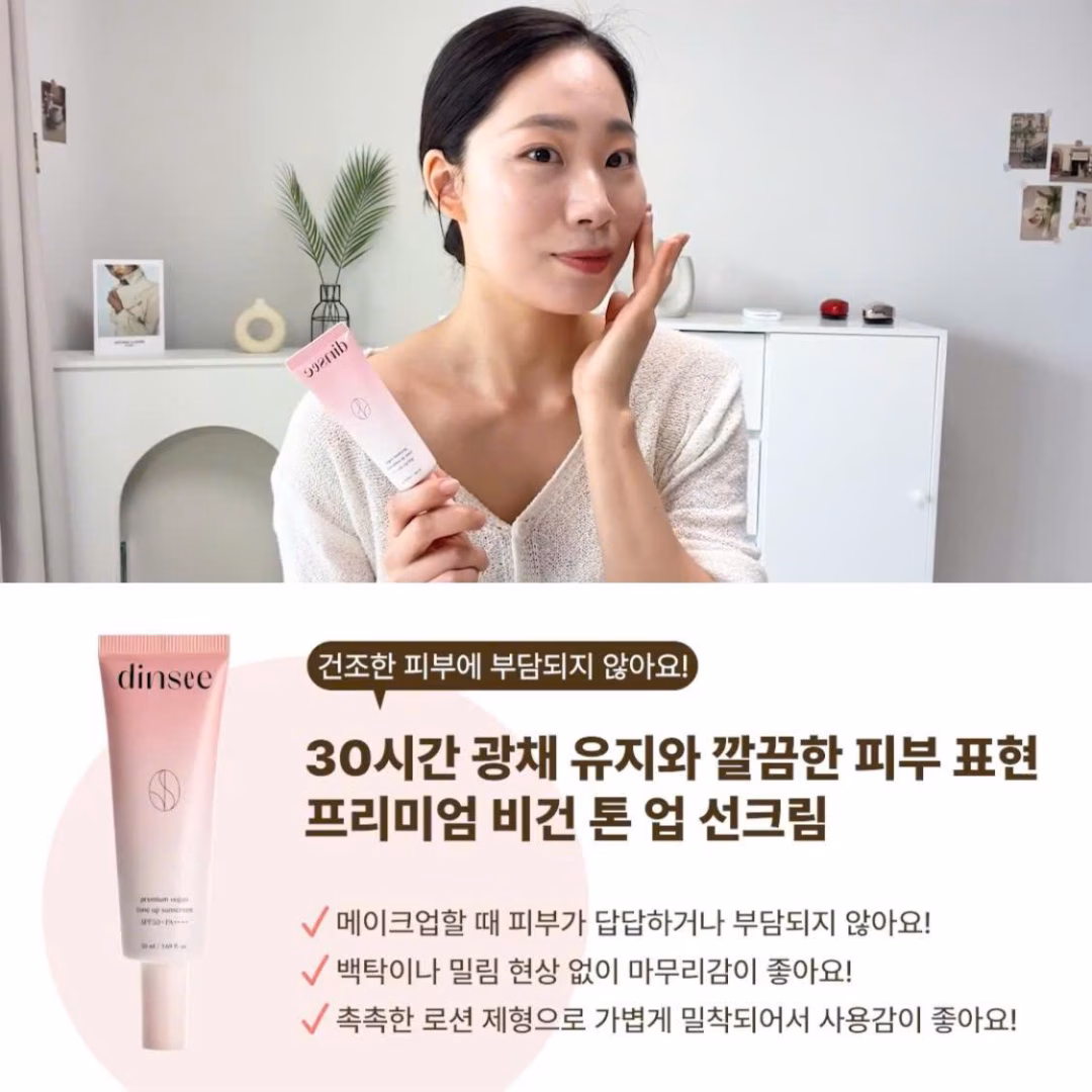 Dinsee Premium Vegan Tone Up Sunscreen SPF50+ PA++++ (Hồng) – Ẩm mịn, nâng tone trắng hồng tự nhiên.