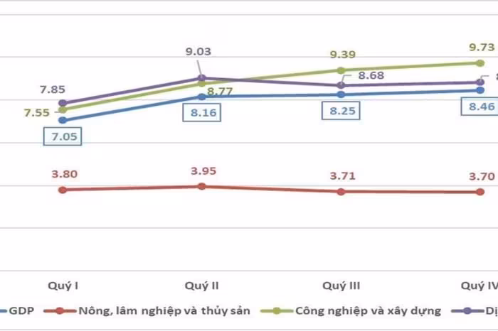 Quý I tăng 7,05%, quý II 8,16%, quý III 8,25% và quý IV 8,46%, cho thấy xu hướng tăng trưởng ổn định và nâng cao qua các kỳ.