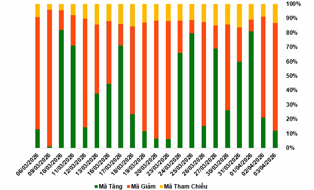 Kết thúc phiên giao dịch ngày 03/04/2026, bức tranh thị trường chứng quyền ghi nhận sự áp đảo của phe bán khi có tới 208 mã giảm, trong khi chỉ có 33 mã tăng và 36 mã giữ nguyên tham chiếu. Dù khối ngoại có động thái mua ròng trở lại với giá trị 344.78 triệu đồng, nhưng nhìn chung cả tuần họ vẫn bán ròng nhẹ 89 triệu đồng, phản ánh sự thiếu hụt động lực dẫn dắt từ dòng vốn ngoại.