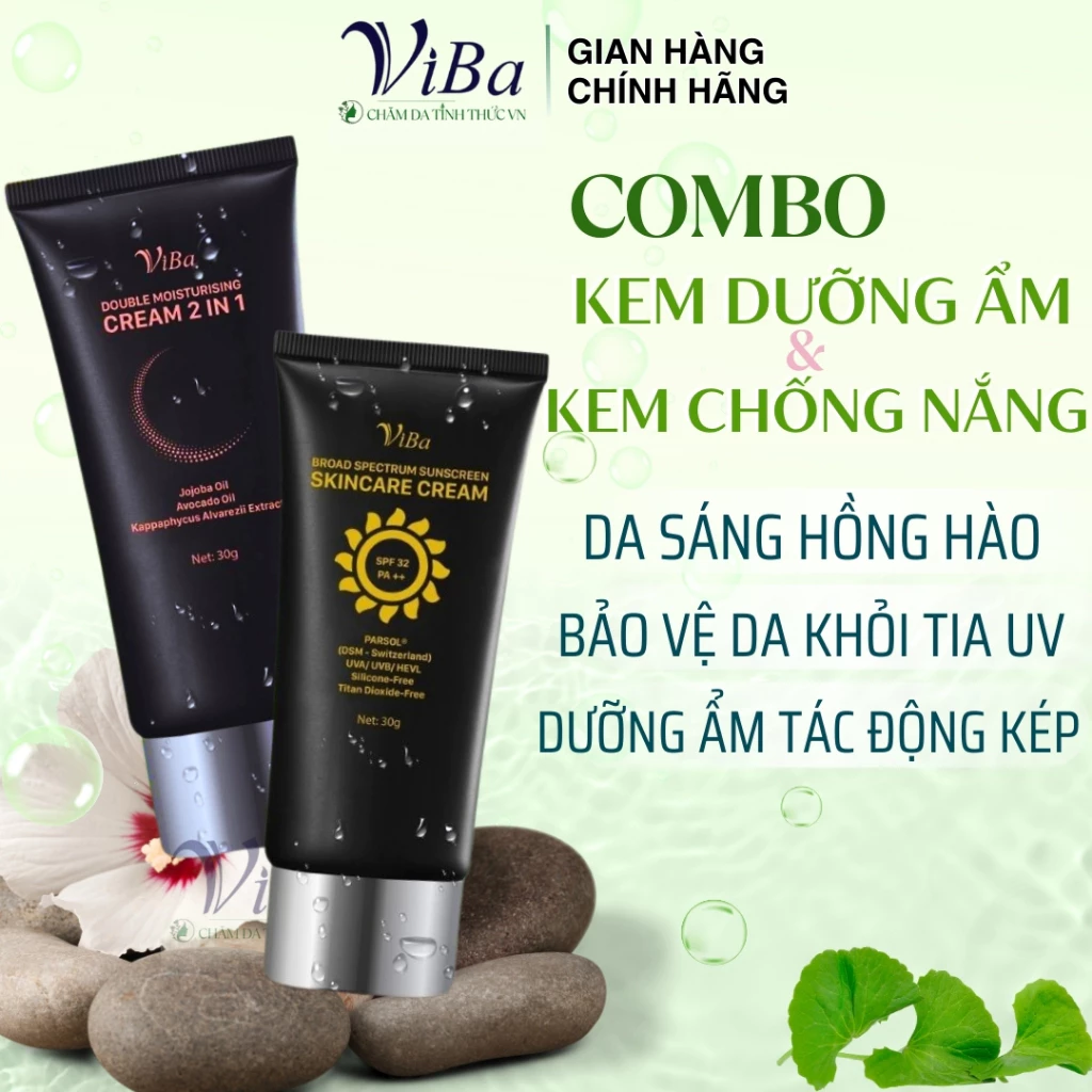 A: Nhiều sản phẩm combo (như VIBA) đã được thiết kế để hoạt động đồng thời, nhưng nếu bạn sử dụng riêng biệt, nên dưỡng ẩm trước, đợi da thẩm thấu rồi mới thoa kem chống nắng.