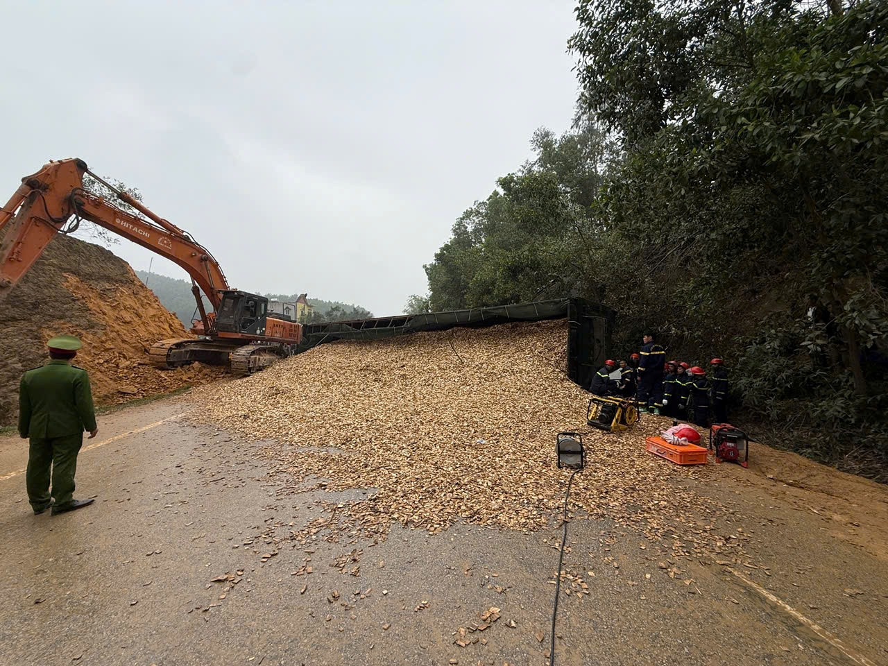 Xe đầu kéo chở dăm gỗ keo lật ngang giữa đường. Ảnh: CTV