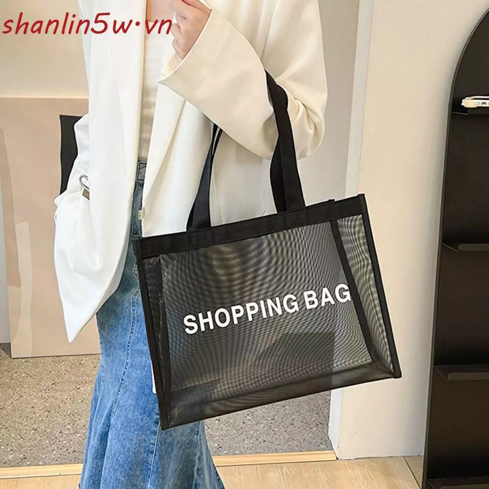 🔥 Túi Tote dung tích lớn SHANLIN, Túi mua sắm lưới trong suốt màu đen một vai, Túi đeo chéo Hasp thông thường Túi du lịch Nylon Túi đựng đồ đi biển đang giảm giá!